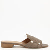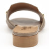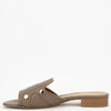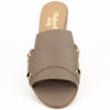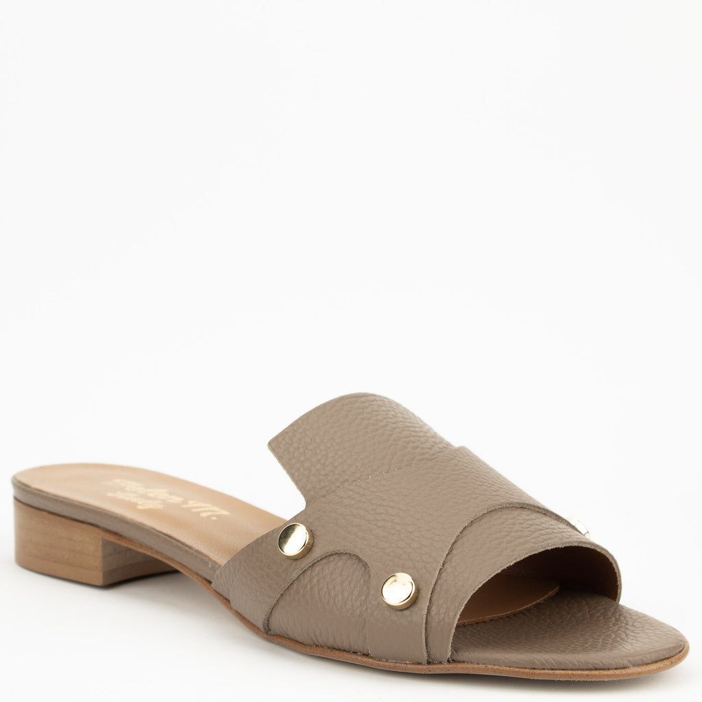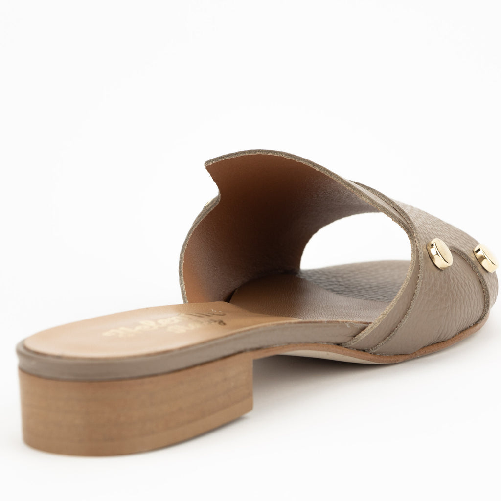 PAN die Pantolette in der Farbe taupe kommt in fein genarbten Nappaleder.Seitlich sind je 2 goldfarbene Metallbuttons als Applikation angebracht.Der Absatz  mit ca.2.5 cm ist unkompliziert.
