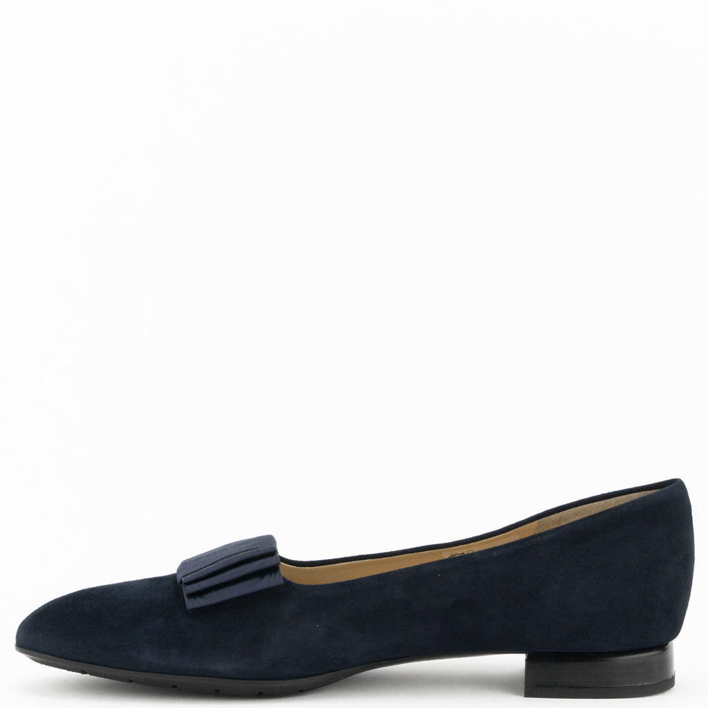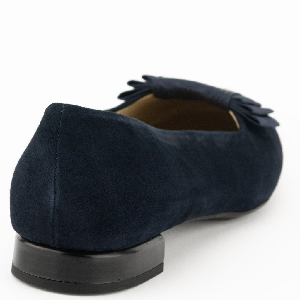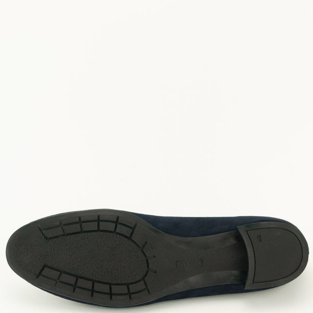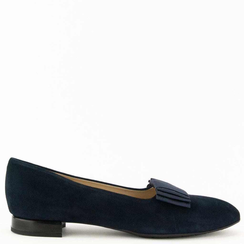 BrunateElegante Ballerina von Brunate aus Italien. Diese klassische und zeitlose Ballerina in dunkelblauem Veloursleder und dazu farblich passender blauer Moiré Rippsschleife. Stilvoll, klassisch und elegant zum Kostüm, Kleid und Hose ein vielseitig einsetzbarer Schuh.