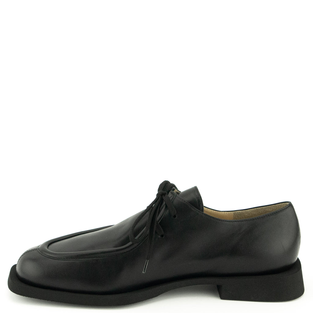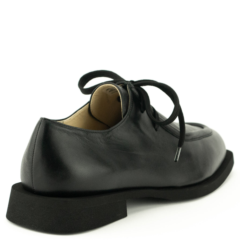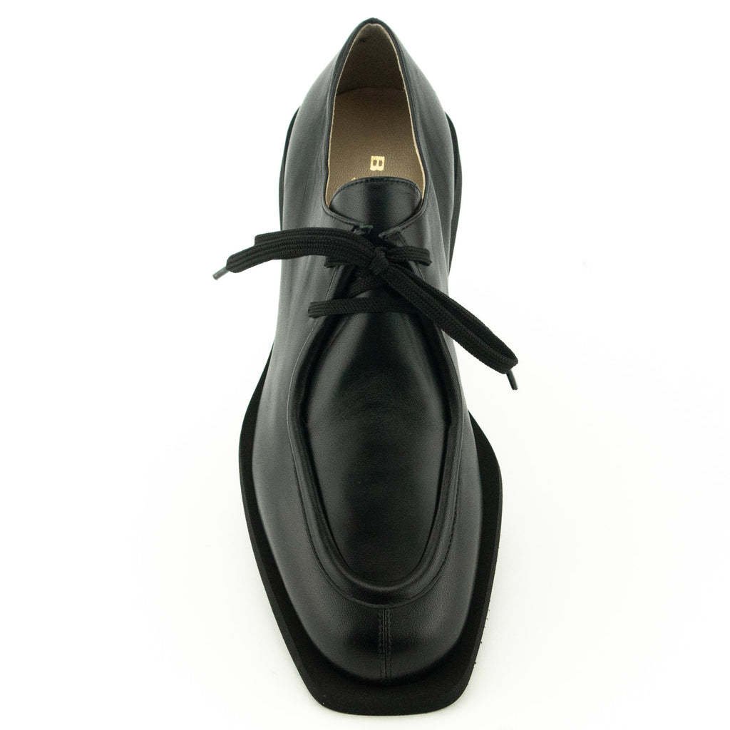 BrunateStylish ist der Schnürschuh in schwarz Nappaleder von Brunate aus Italien. Die kantige und weiche Porosohle und der ausgestellte Absatz (3cm) setzen das geradlinige Design fort.