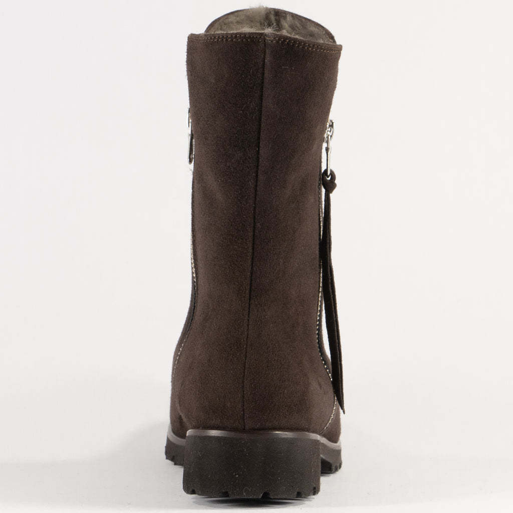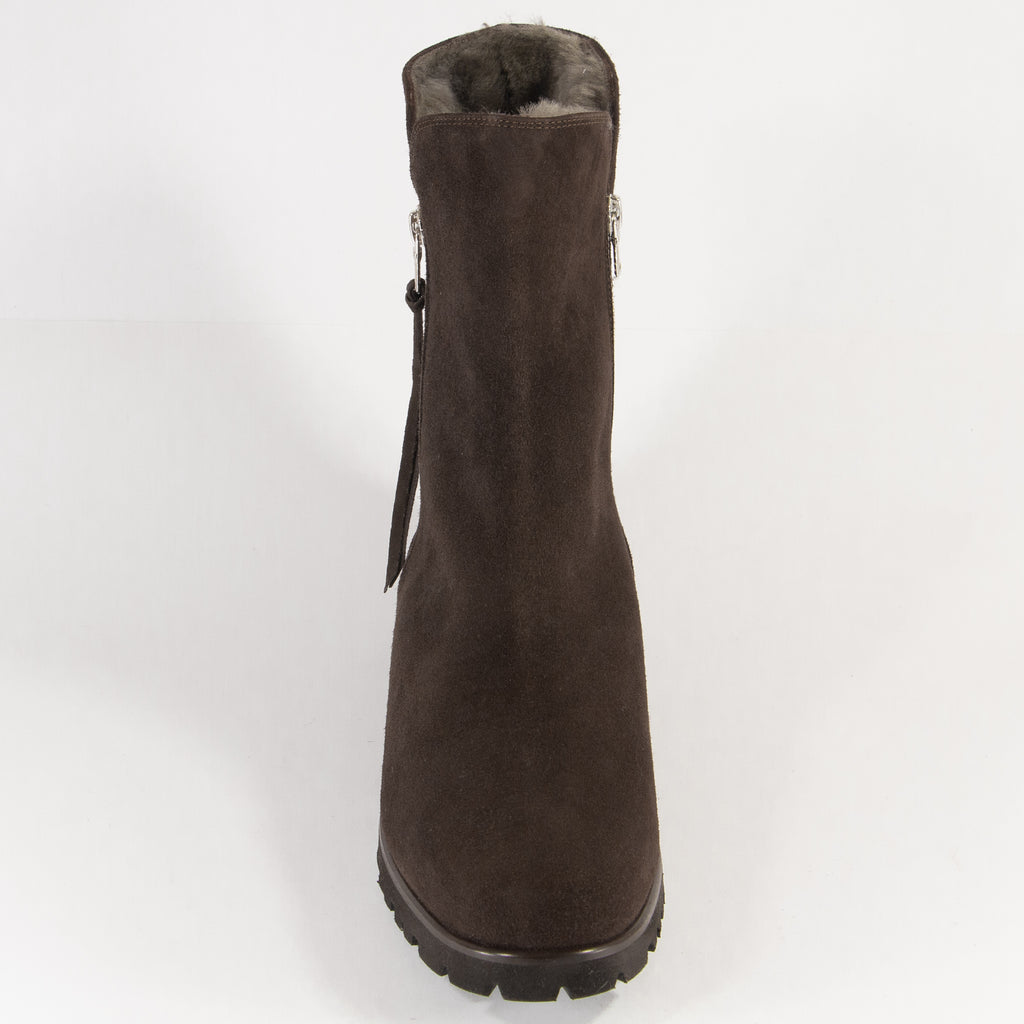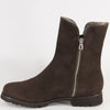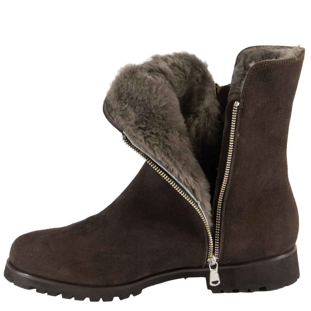 Helen M.Die dunkelbraune Stiefelette aus Italien für kalte Wintertage in weichem Velourleder ist mit einem kuscheligen Lammfellfutter gefüttert. Die beidseitig, jeweils seitlich angebrachten Reissverschlüsse lassen Sie leicht hineinschlüpfen. Eine vielseitig kombinierbare Winterstiefelette.
