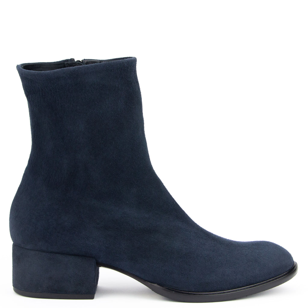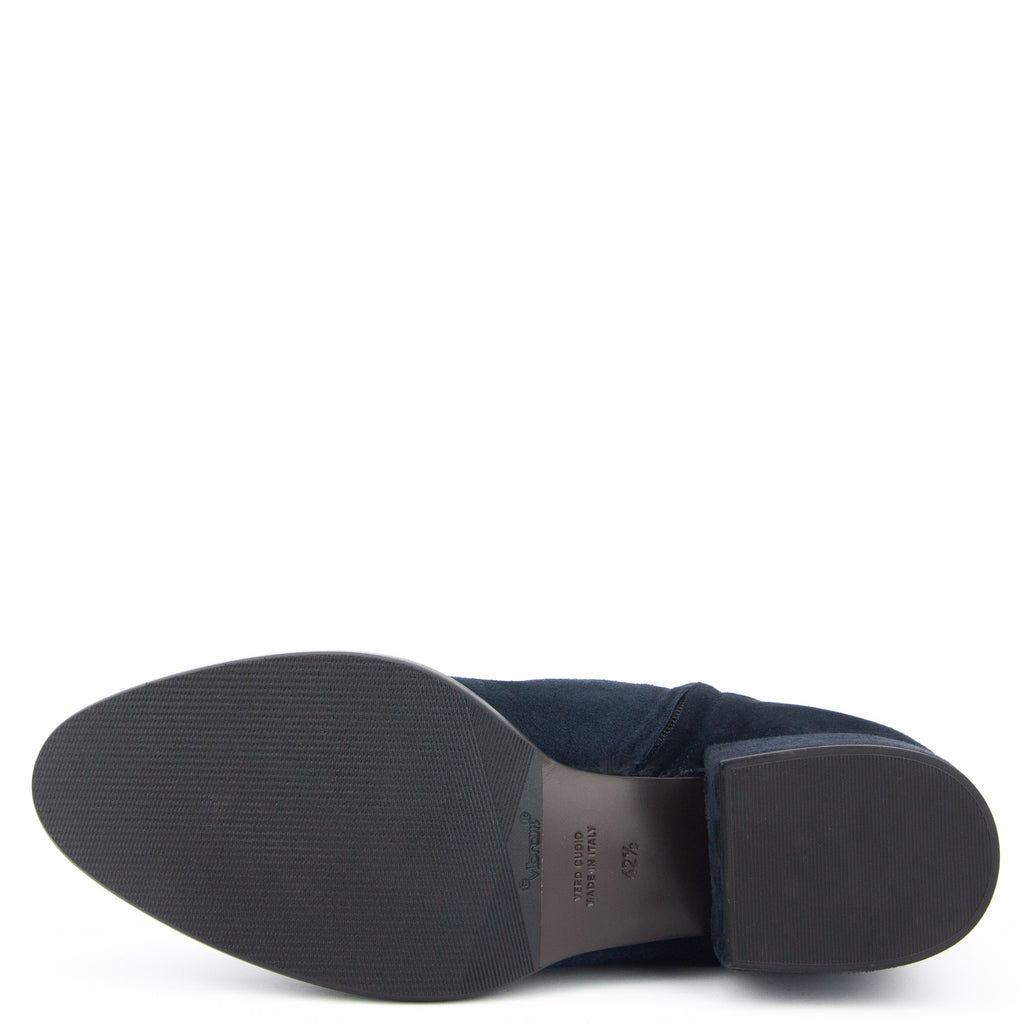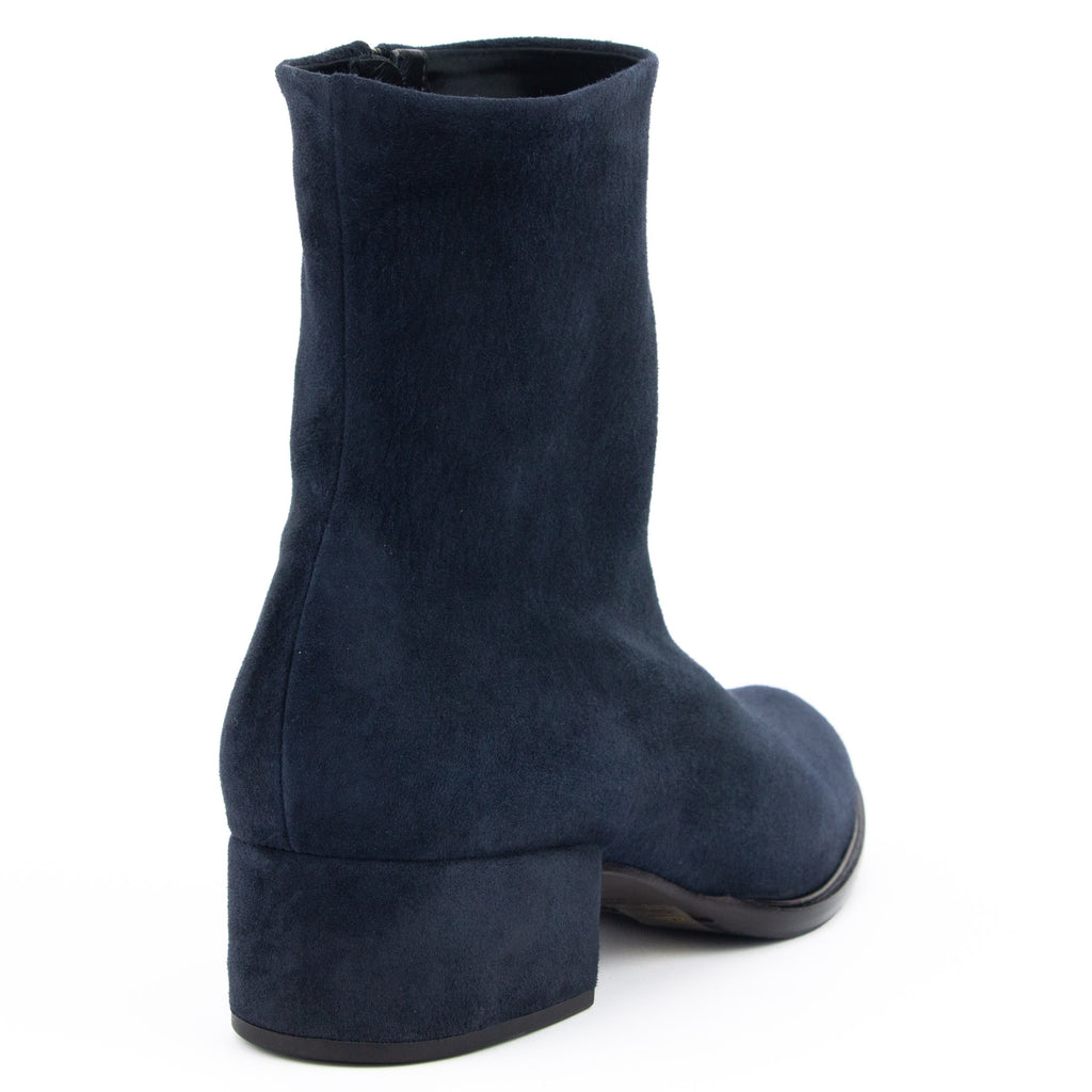 Ein edles Highlight ist diese Stiefelette in dunkelblauem Veloursleder der Schaft ist in  gestretchten Verloursleder ausgeführt von Lorenzo Masiero aus Venetien. Der perfekt anliegende Stiefelschaft ist perfekt ob zu Hose, Rock oder Kleid. Der Absatz hat eine Höhe von 3.5 cm.