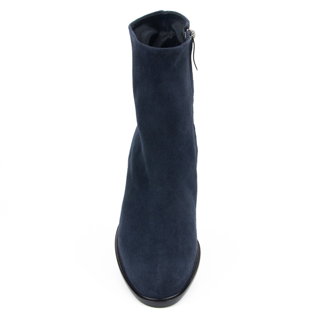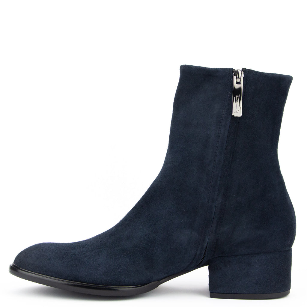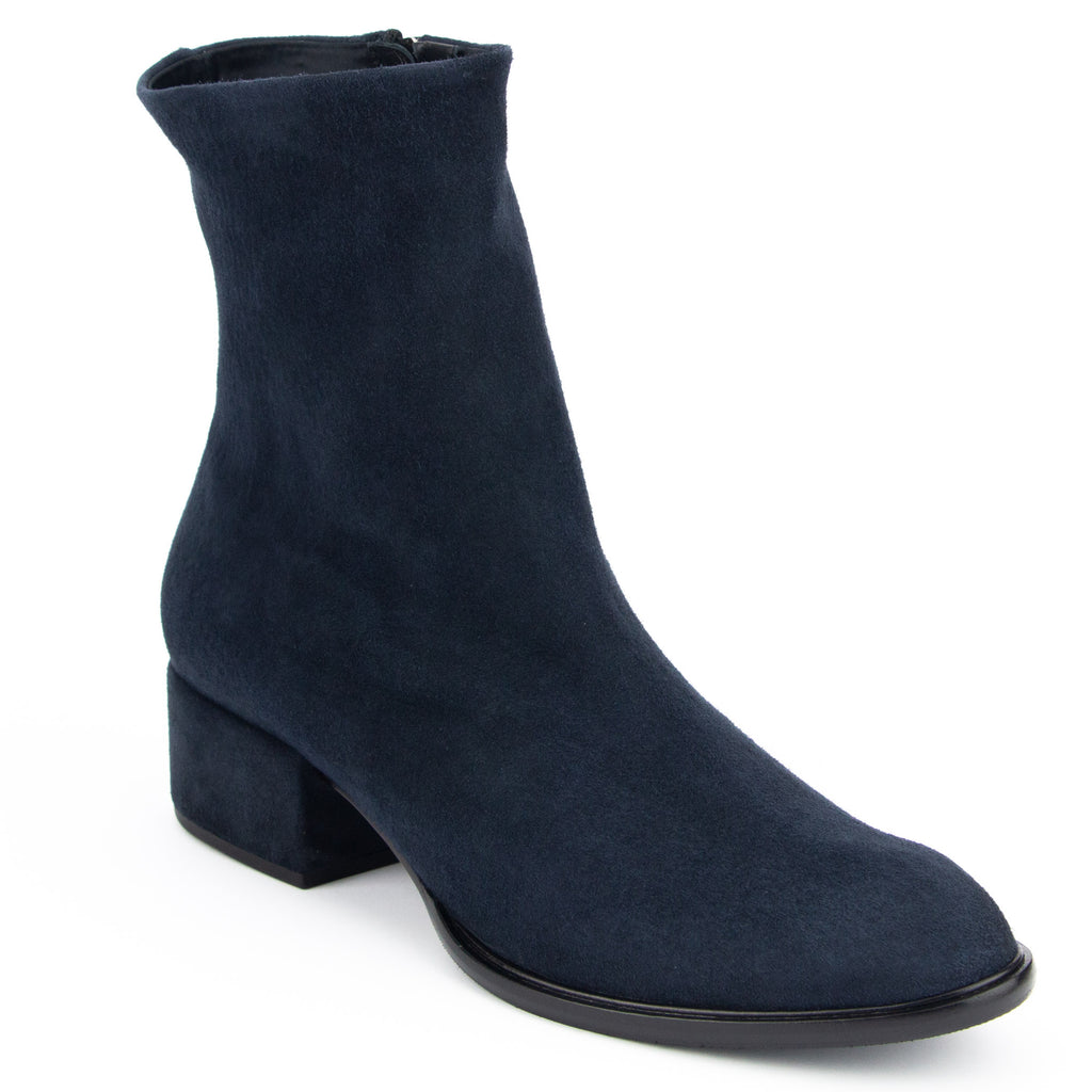 Ein edles Highlight ist diese Stiefelette in dunkelblauem Veloursleder der Schaft ist in  gestretchten Verloursleder ausgeführt von Lorenzo Masiero aus Venetien. Der perfekt anliegende Stiefelschaft ist perfekt ob zu Hose, Rock oder Kleid. Der Absatz hat eine Höhe von 3.5 cm.
